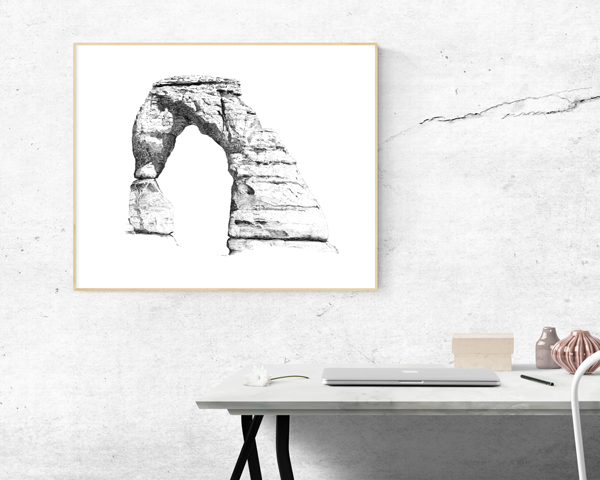 This Delicate Arch wall art was created to preserve that feeling. Instead of focusing on the warm reds and oranges of the desert, this black and white interpretation emphasizes structure, contrast, and space — the curve of the freestanding arch and the openness surrounding it.