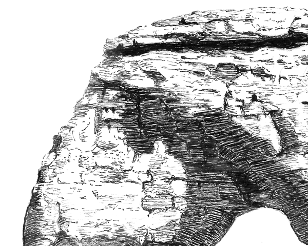 This piece was drawn using fine, deliberate linework to highlight the sculpted contours of the sandstone. Varying line weights and cross-hatching convey texture — smooth in some areas, weathered and striated in others. Light and shadow are suggested through subtle shading, reflecting the clarity and stark contrast of the Utah desert.