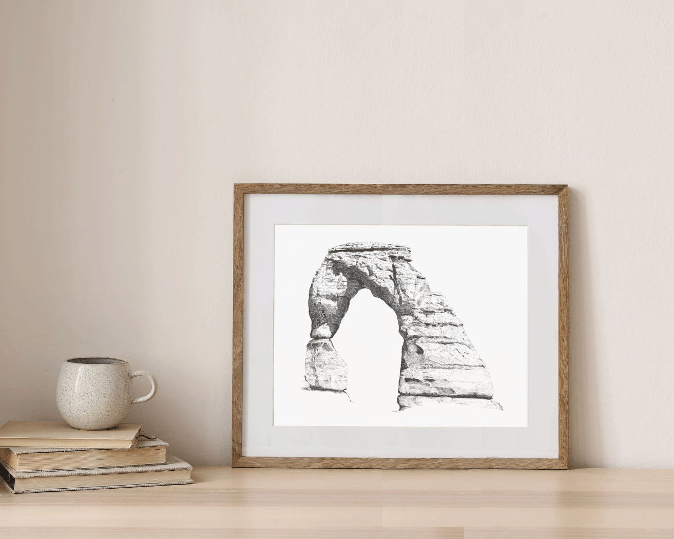 A detailed pen and ink illustration of Delicate Arch in Arches National Park. This black and white wall art captures the structure, scale, and stillness of one of Utah’s most iconic sandstone formations. Designed for hikers, national park lovers, and anyone who wants to bring a piece of the desert landscape into their home.